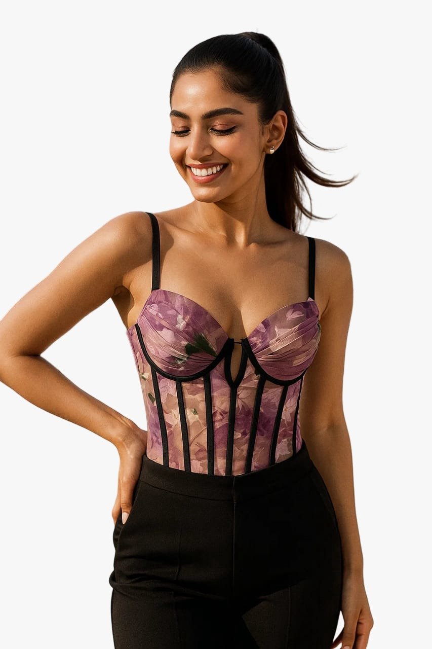 Step into romantic style with the ‘Lavender Bloom Mesh Bustier Top.’ This structured corset-style top features delicate spaghetti straps and a flattering, supportive underwire design. It is crafted from a sheer mesh overlay showcasing a lovely blurred floral print in lavender and deep mauve tones. The top is finished with contrasting black binding along the boning and edges, offering a bold yet feminine look perfect for pairing with tailored trousers or high-waist skirts.