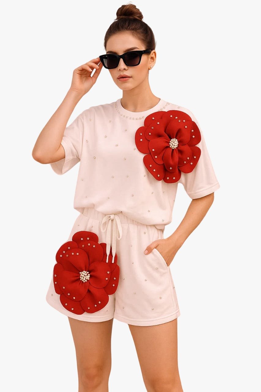 Step out in dazzling style with the ‘Pearl Bloom Co-ord Lounge Set.’ This playful two-piece set features a relaxed-fit t-shirt and matching drawstring shorts, both crafted from soft fabric in a delicate blush or off-white hue. The set is subtly adorned with scattered small pearl-like studs for a soft shimmer. The standout features are the dramatic, three-dimensional crimson red floral appliqués, each accented with central rhinestone and pearl clusters, placed boldly on the top and shorts. This set is perfect for making a stylish statement at casual gatherings or festivals.