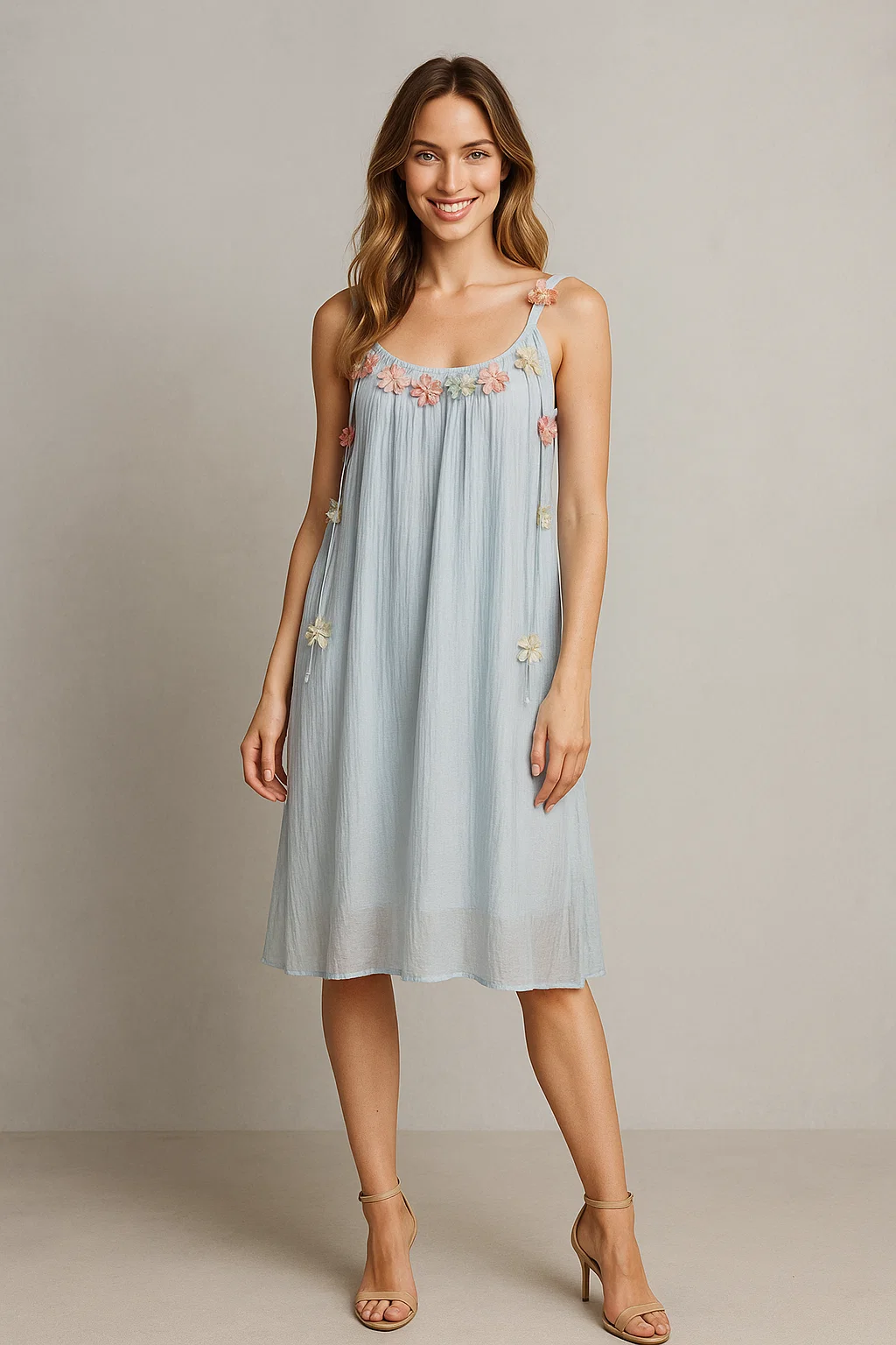 Drift through summer days in the ‘Sky Breeze Floral Cami Dress.’ Crafted from soft, lightweight muslin or gauze-like fabric in a tranquil sky blue hue, this dress features a relaxed, tiered silhouette that falls just below the knee. The delicate spaghetti straps and bodice are sweetly adorned with scattered 3D fabric floral appliqués in soft pink and cream tones. This breezy dress is perfect for vacation, warm-weather outings, and achieving an effortlessly romantic look.
