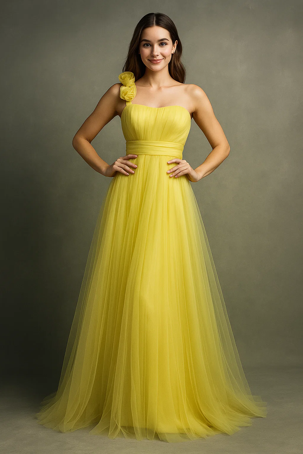 Step into the spotlight with the ‘Sunshine Bloom One-Shoulder Gown.’ This magnificent dress is crafted from voluminous, flowing layers of tulle in a brilliant, bright golden yellow hue. It features a beautifully fitted, pleated bodice with a defined wide waistband that cinches the figure. The dramatic one-shoulder neckline is accented by a delicate 3D floral appliqué, adding a romantic, feminine detail. With its full A-line silhouette, this gown creates an enchanting, dreamy look perfect for formal events, proms, or special occasions.